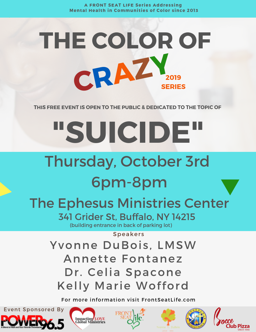 Color of Crazy: Suicide Thursday, October 3, 2019 6:00 PM 8:00 PM Ephesus Ministries Center 341 Grider Street Buffalo, NY, 14215 United States (map) Google Calendar ICS